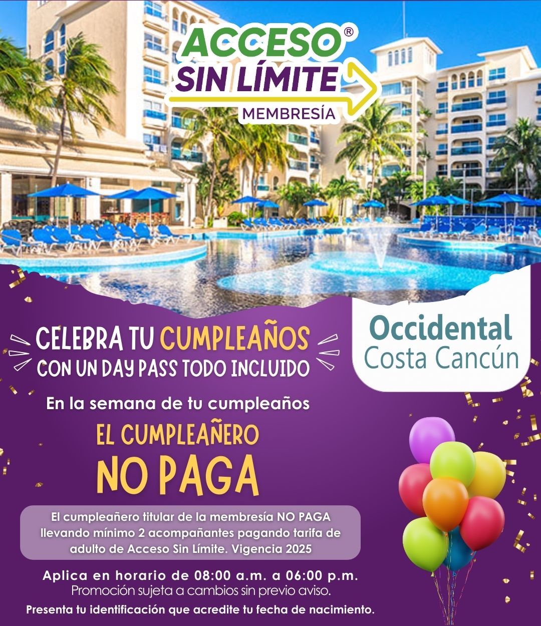 El cumpleañero titular de la membresía NO PAGA llevando mínimo 2 acompañantes pagando tarifa de adulto de Acceso Sin Límite. Vigencia 2025.